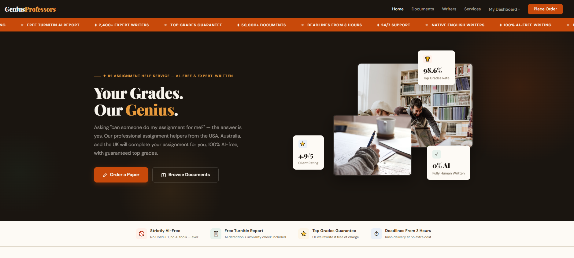 In a landscape cluttered with overpriced services and AI-generated shortcuts, GeniusProfessors delivers something genuinely valuable: affordable, human-crafted, original academic work — delivered on time and verified for plagiarism and AI content before it ever lands in your inbox.